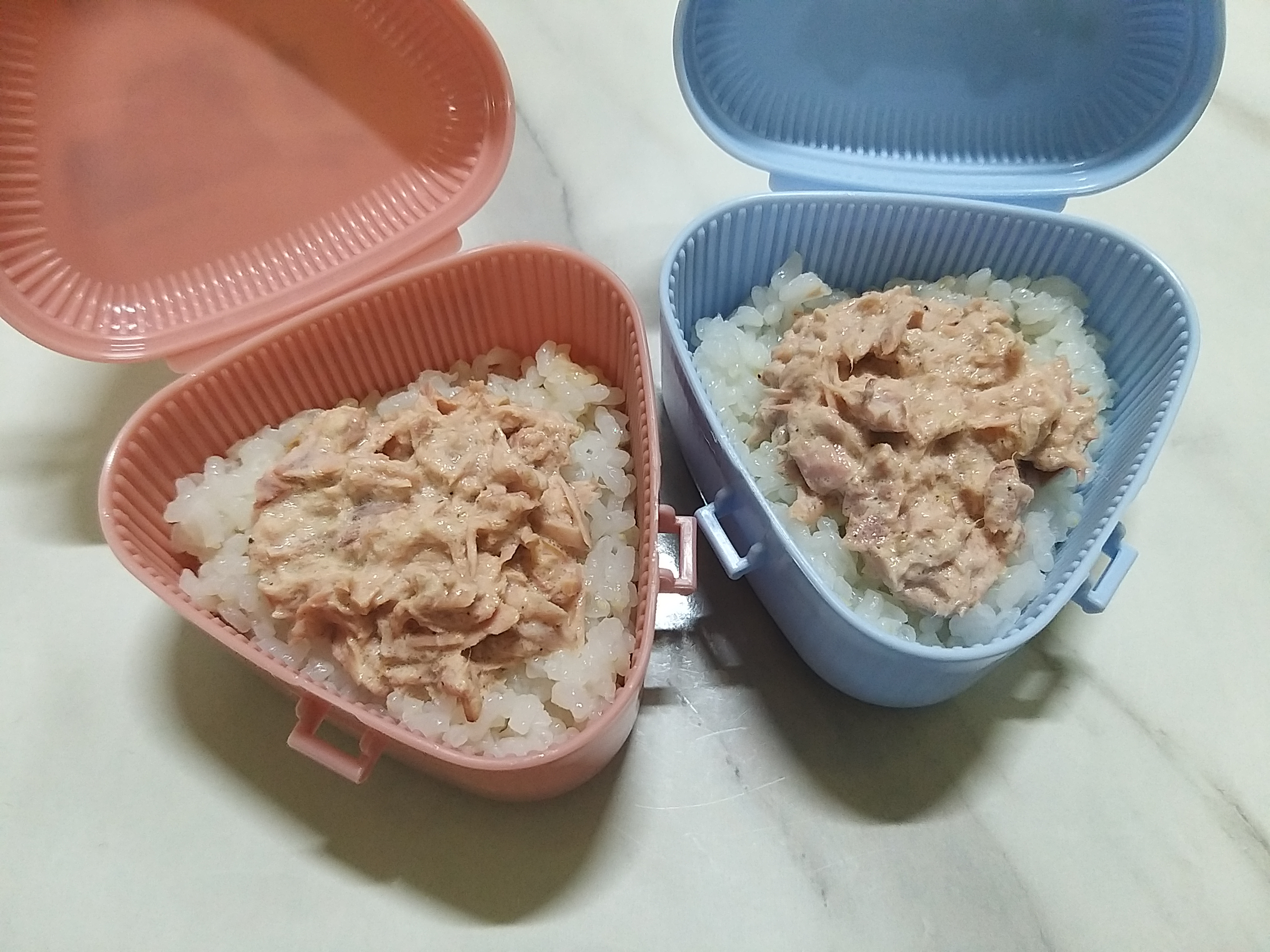 케이스에 밥을 반 깔고 그 위로 참치마요도 얹고